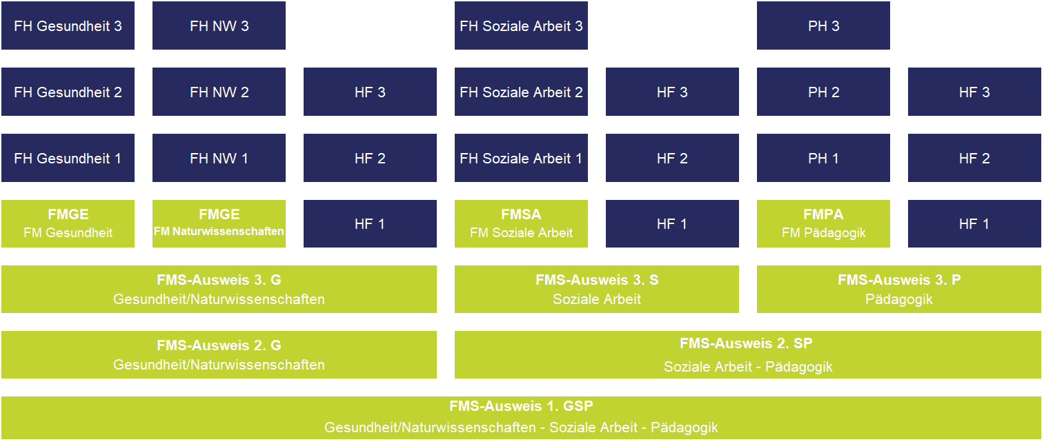 - Ein Jahr Fachmaturität (FM) im gleichen Berufsfeld wie der erworbene Fachmittelschulausweis. Der Fachmaturitätsausweis ermöglicht den Zugang zur Fachhochschule (FH) oder zur Pädagogischen Hochschule (PH), bzw., in Freiburg, für die Ausbildung zur Primarlehrperson an der Fakultät für Erziehungs- und Bildungswissenschaften der Universität Freiburg.